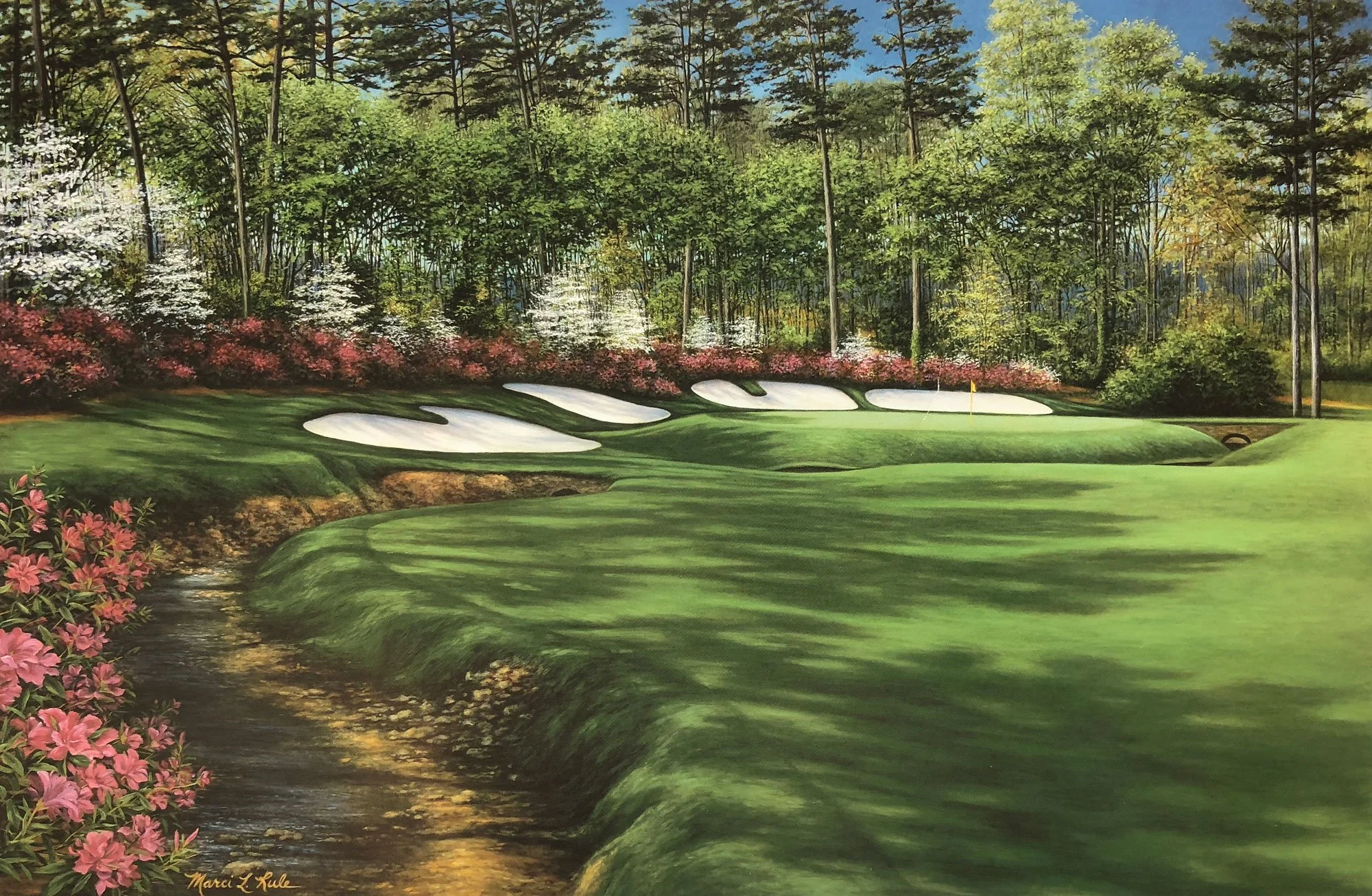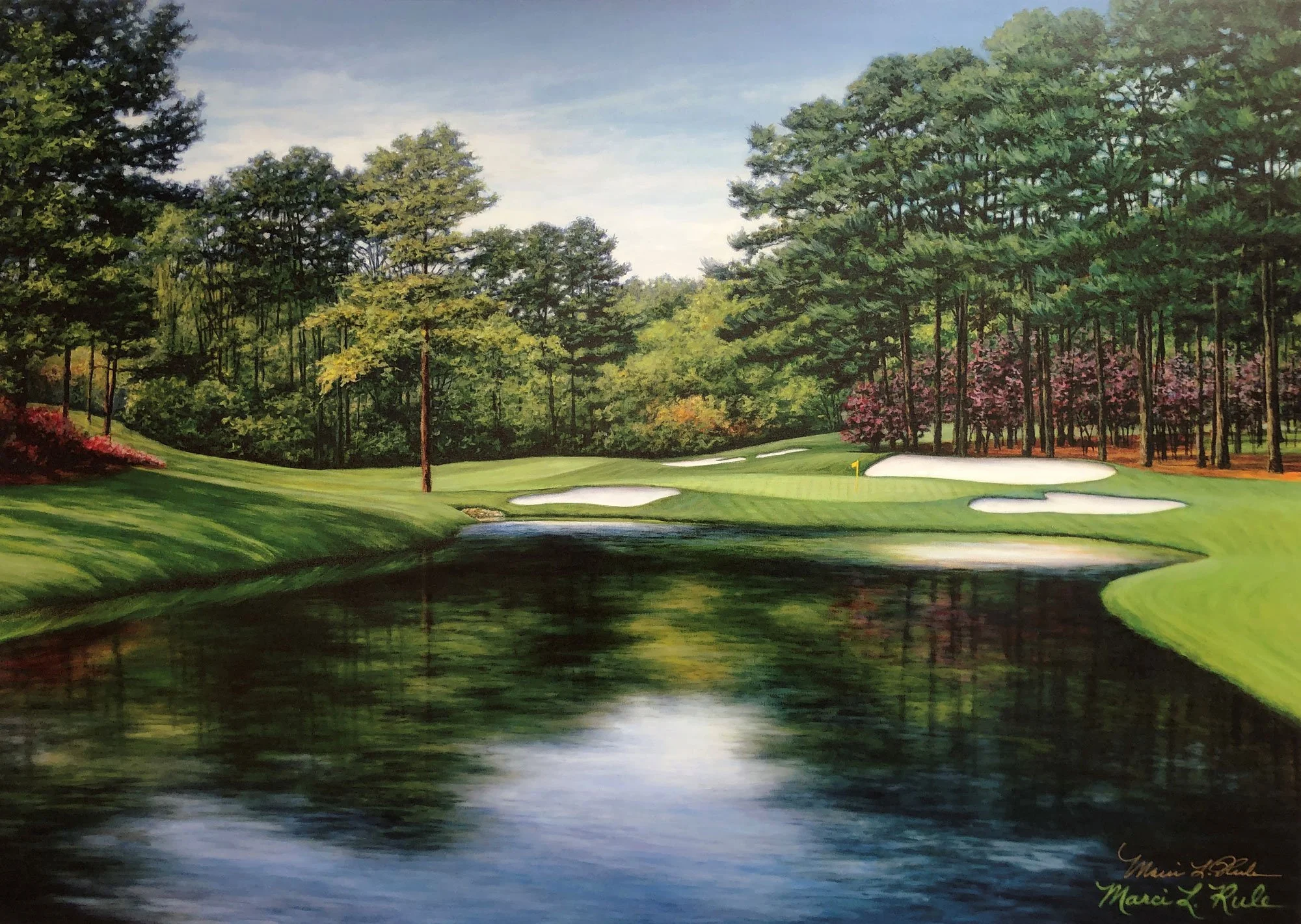 An oil painting by Marci Rule of Augusta National's Redbud #16, with a water hazard in the foreground, surrounded by green grass and trees, with sand bunkers and a flag marking the hole on the green in the background center..