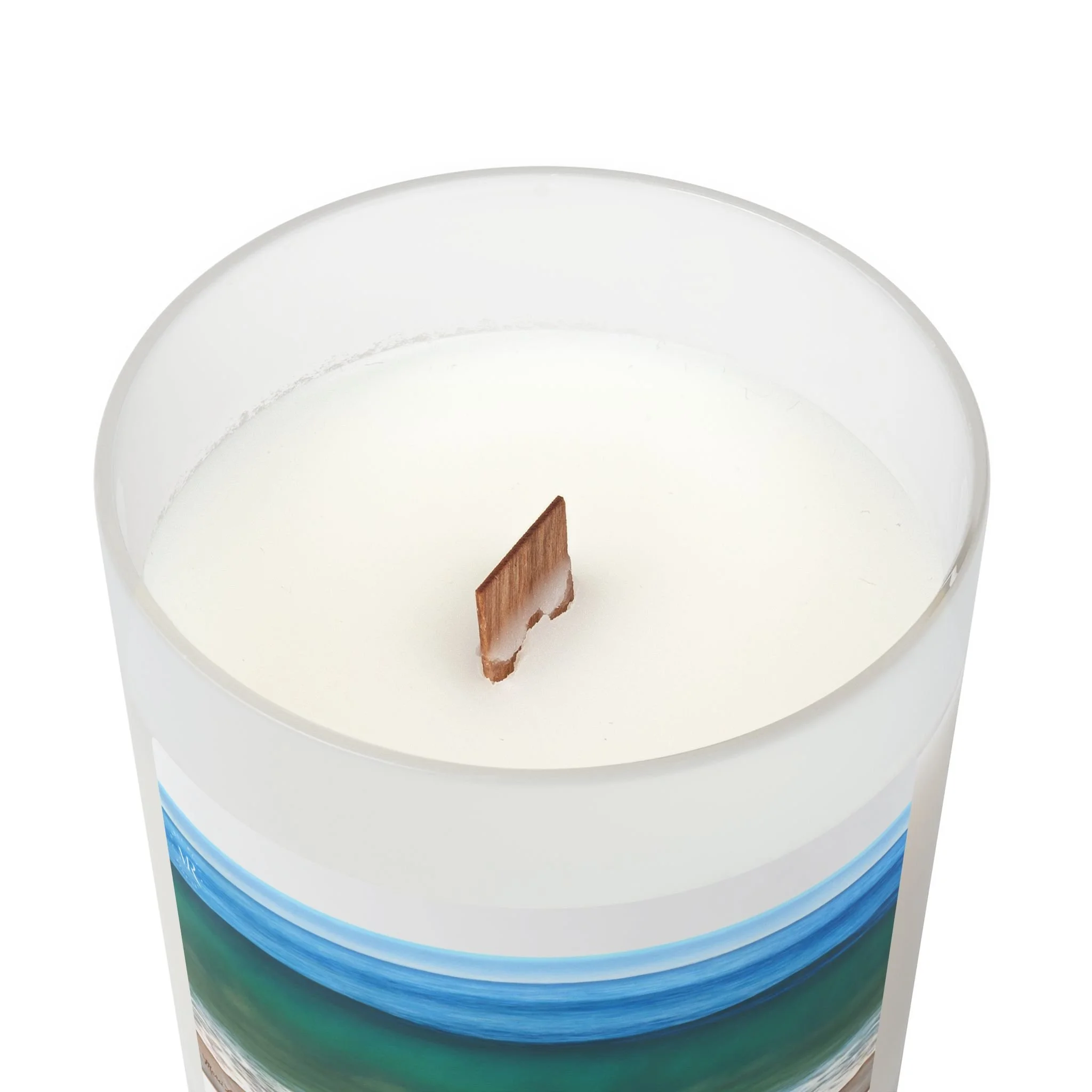 A calming candle featuring an oil painting of turquoise colored water on sand with white foam, perfect for creating a relaxing atmosphere in any room. Ideal for those who appreciate a serene ambiance and relaxation in their daily life. Relevant for occasions like birthdays, housewarmings, or as a self-care treat.