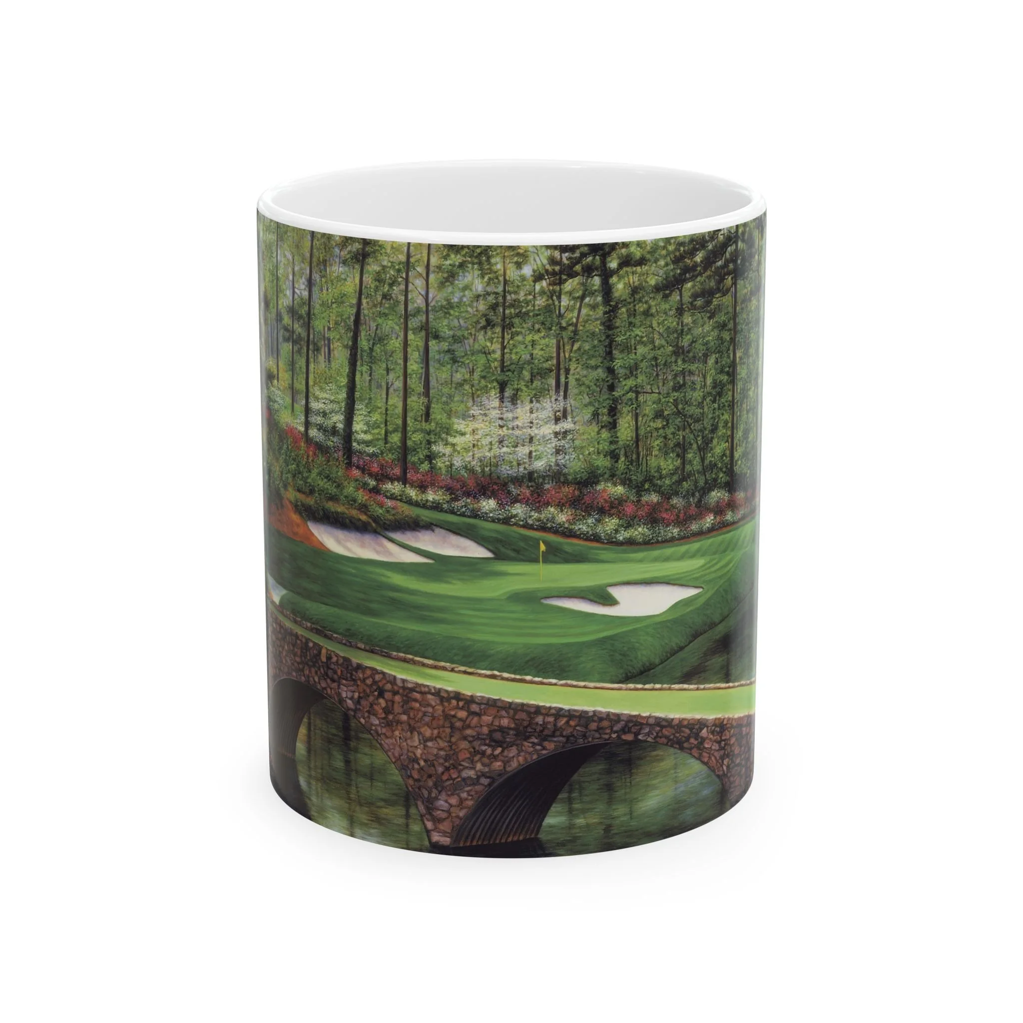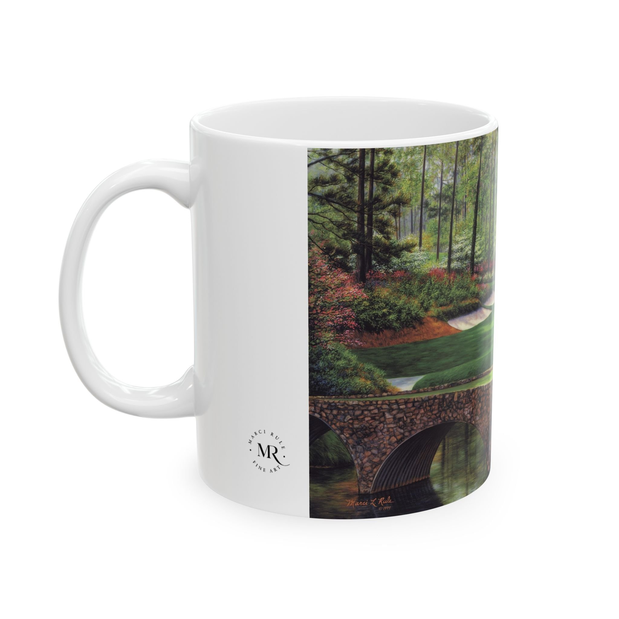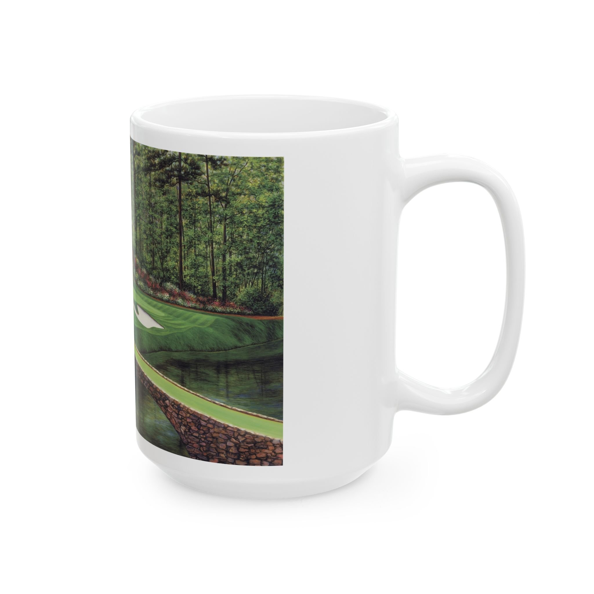 Experience the iconic beauty of Augusta National Golf Course with this stunning Golden Bell #12 ceramic mug featuring a realistic oil painting by artist Marci Rule. Perfect for golf enthusiasts and art lovers alike, this mug brings a touch of elegance and tranquility to your morning coffee routine. Ideal for gifting during Father's Day, birthdays, or as a special treat for yourself.