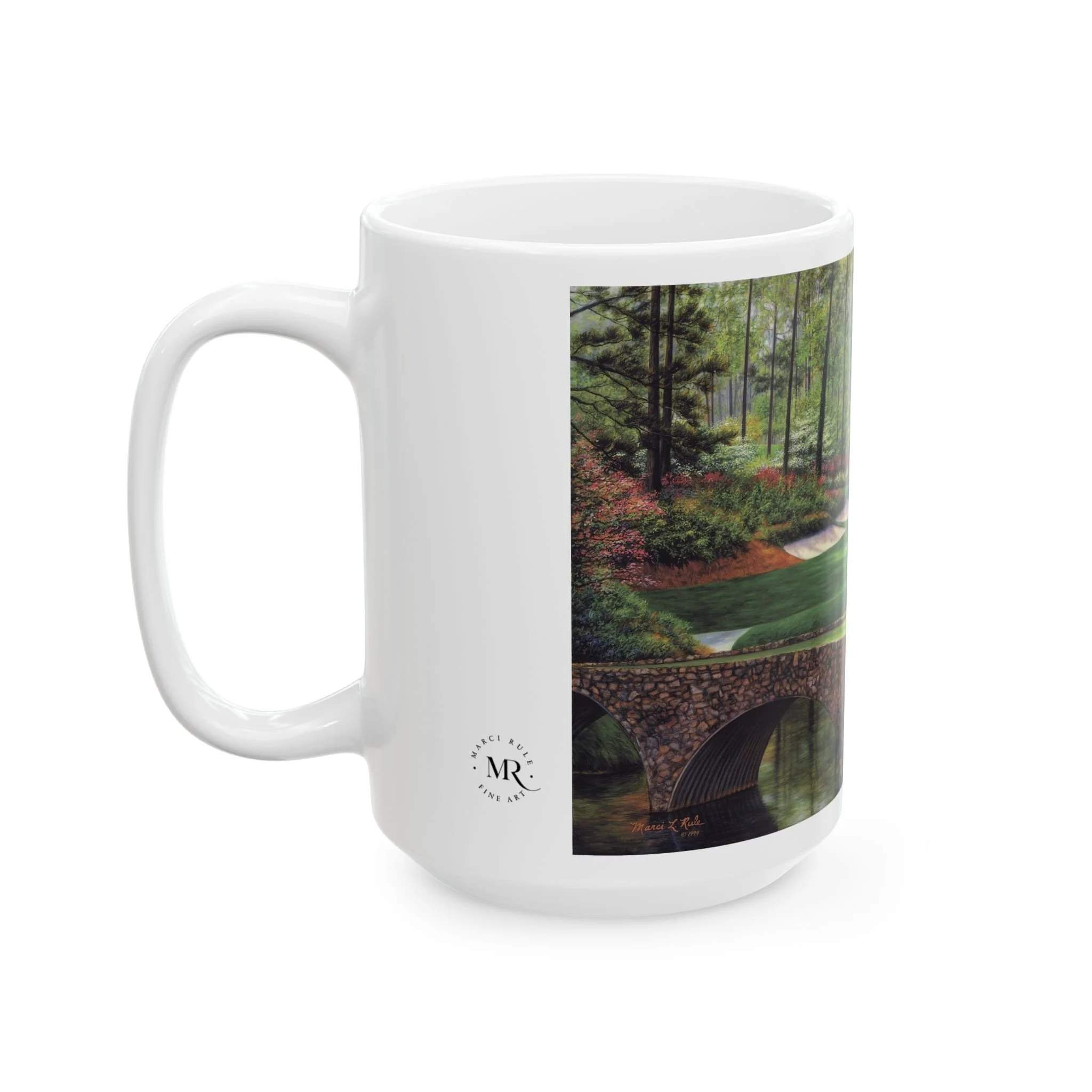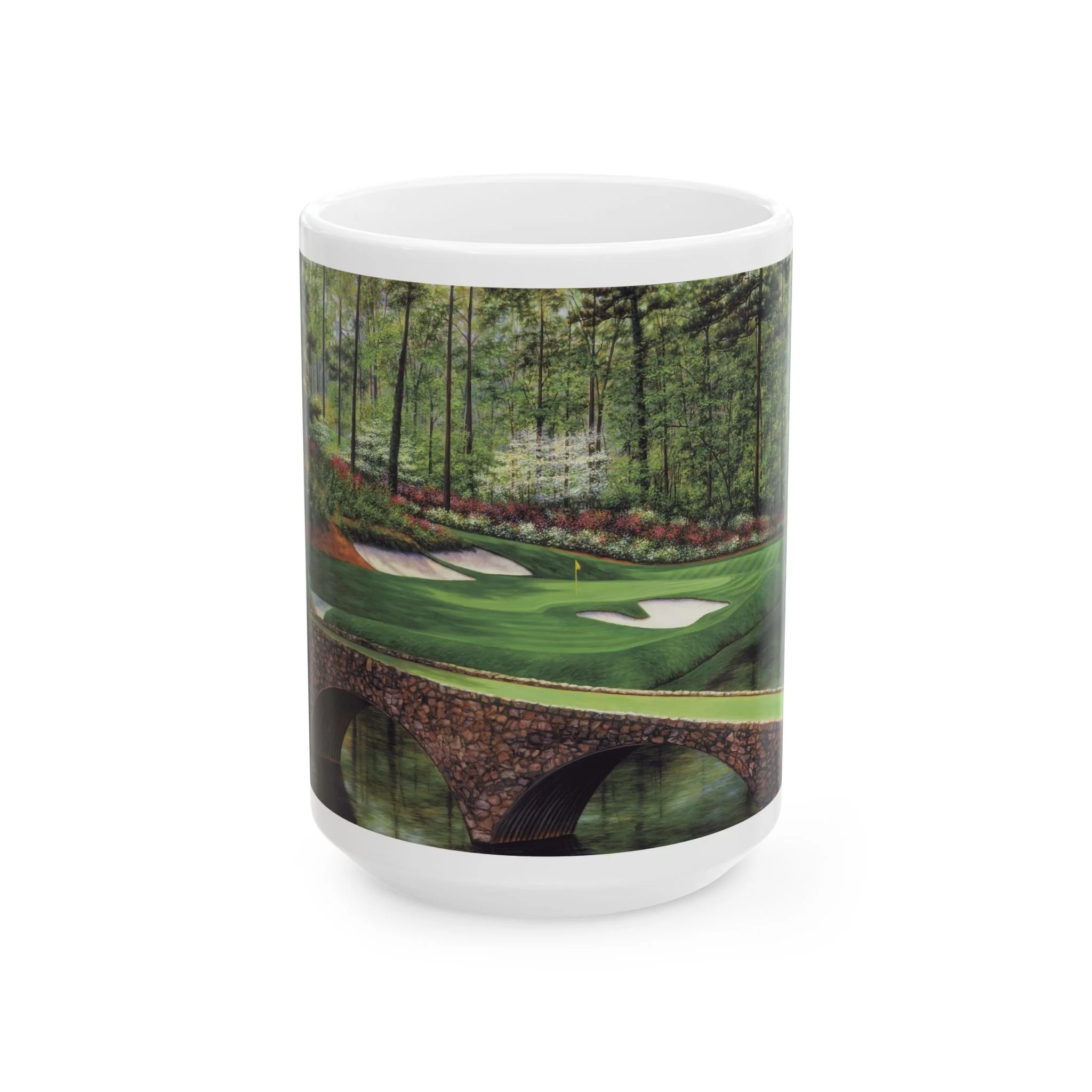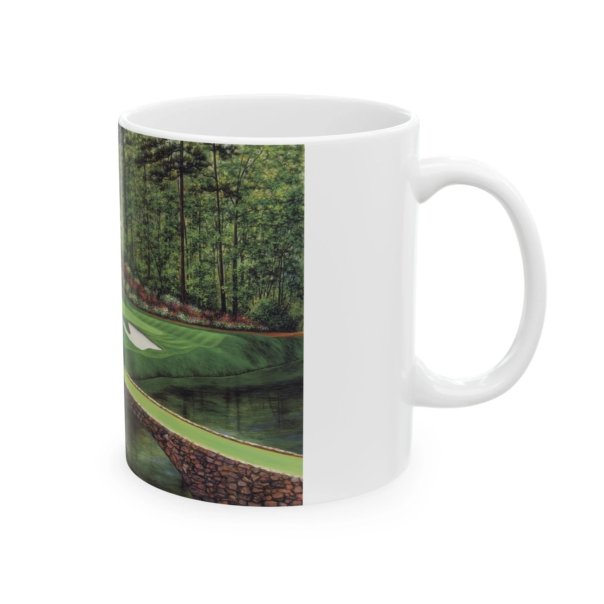 Experience the iconic beauty of Augusta National Golf Course with this stunning Golden Bell #12 ceramic mug featuring a realistic oil painting by artist Marci Rule. Perfect for golf enthusiasts and art lovers alike, this mug brings a touch of elegance and tranquility to your morning coffee routine. Ideal for gifting during Father's Day, birthdays, or as a special treat for yourself.