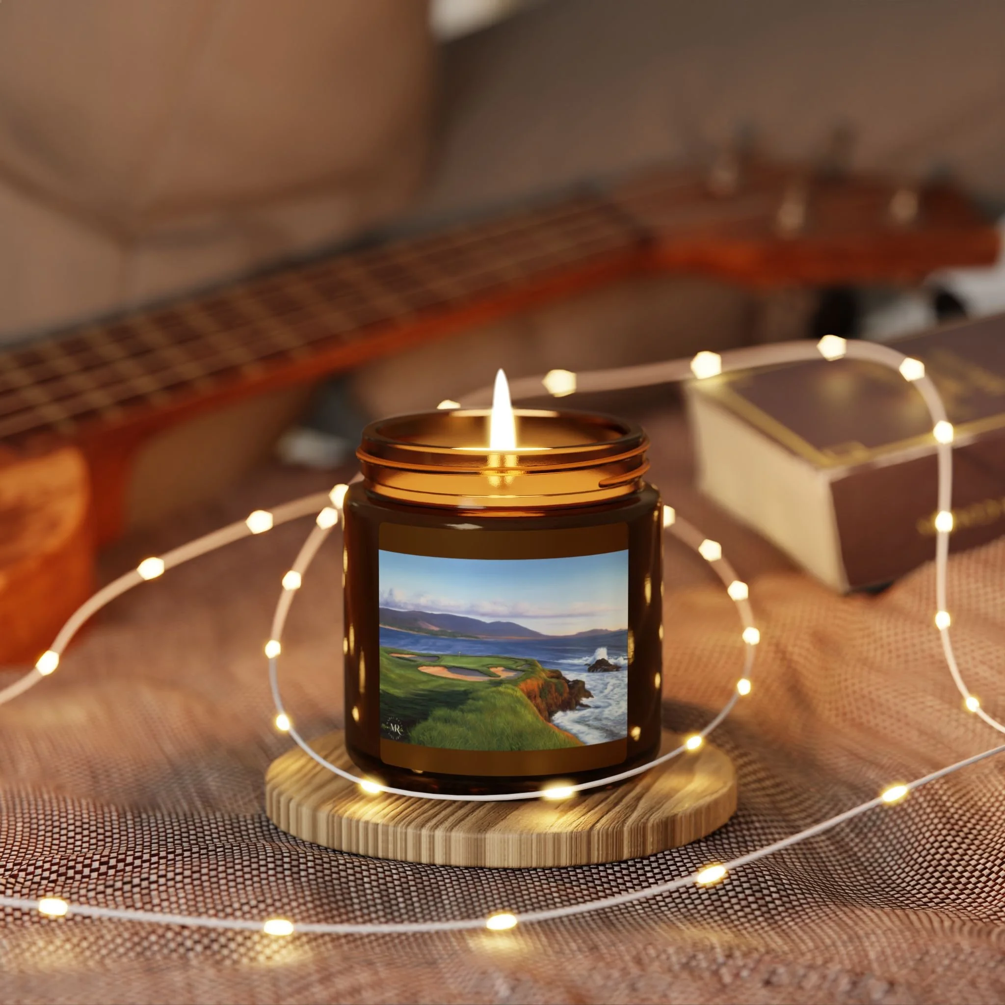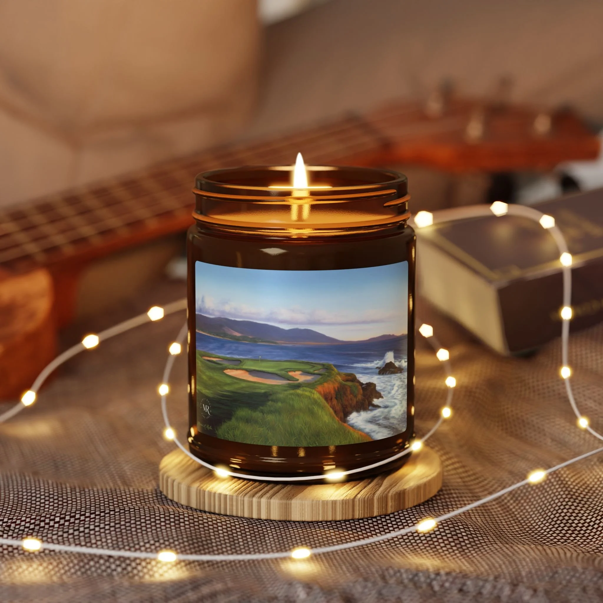 Experience the cozy and festive atmosphere with this scented candle featuring an oil painting of Pebble Beach #7 by Marci Rule. Perfect for those looking to add warmth and fragrance to their space during the holiday season or special occasions. Ideal for those who enjoy natural and eco-friendly products.