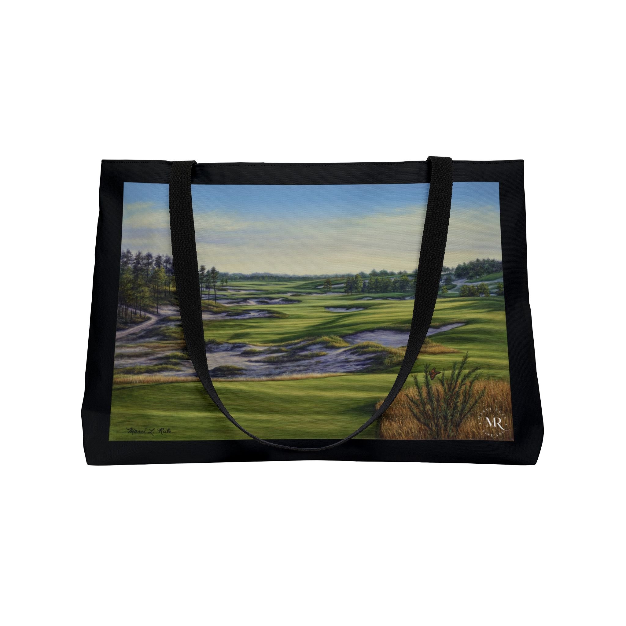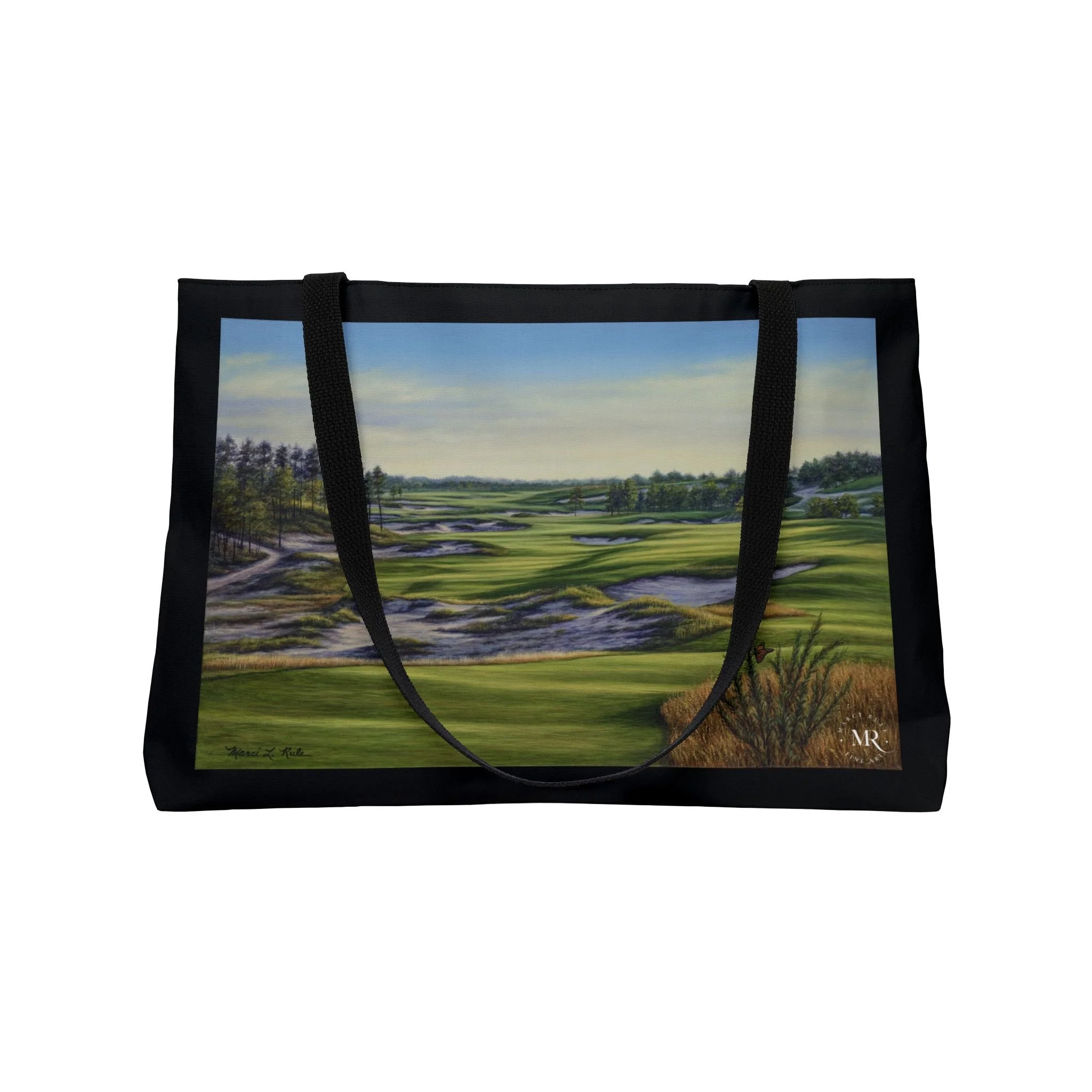 Carry a slice of Woodland Hills with you wherever you go. This spacious black tote showcases a detailed, oil-painting of the signature hole at Indiana’s Woodland Hills Golf Course by Marci Rule. Golfers and course regulars will recognize the line of the hole and feel a warm nudge of nostalgia when they sling this over their shoulder. Use it for weekend gear, scorecards and tees, or as a carry-all on days when you want a reminder of early rounds and good company at the clubhouse.