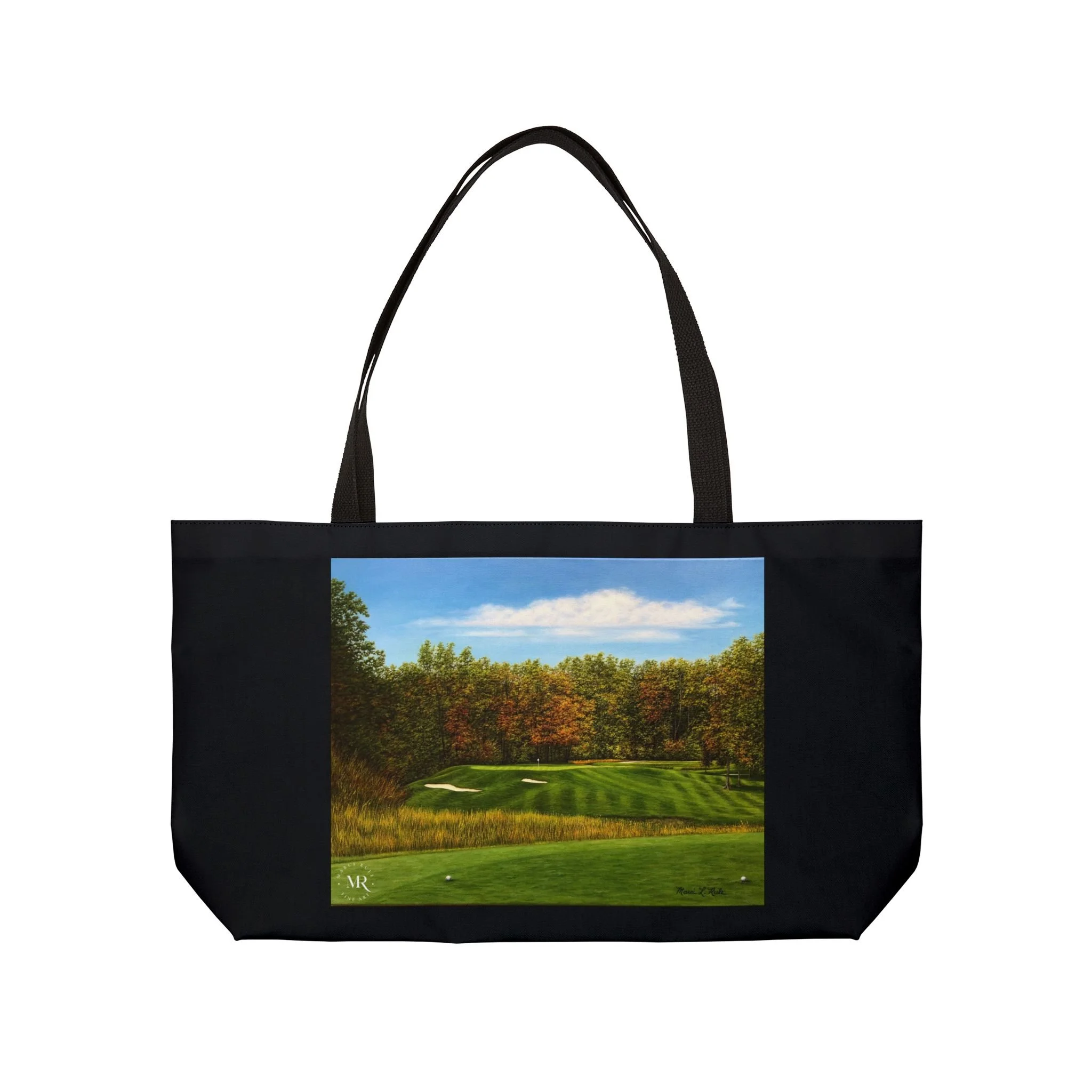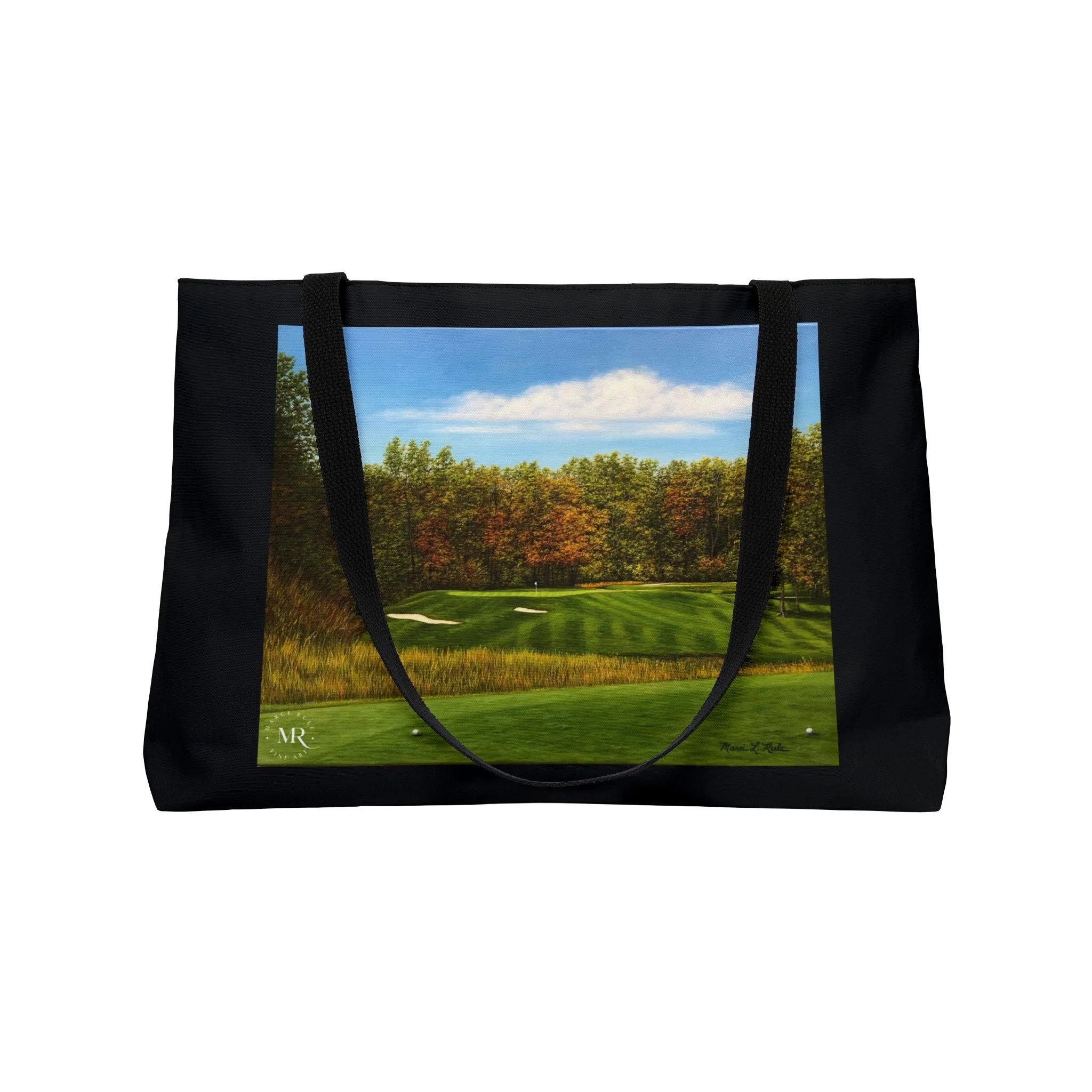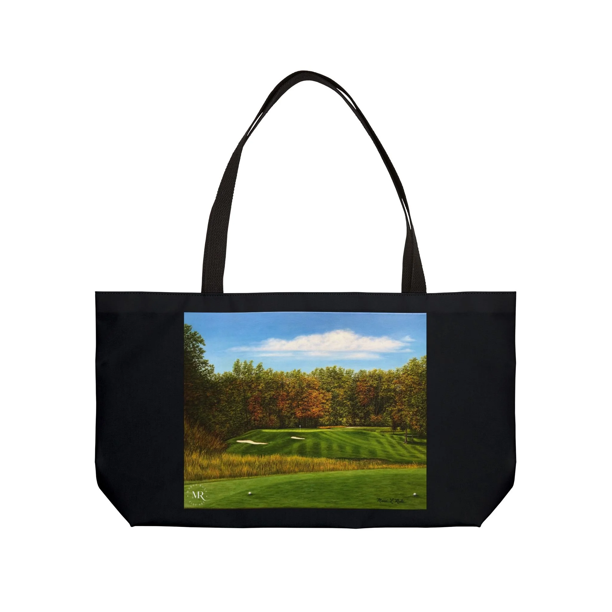Weekender Black Tote Bag |Woodland Hills Golf Course Oil Painting | Indiana golf signature hole
