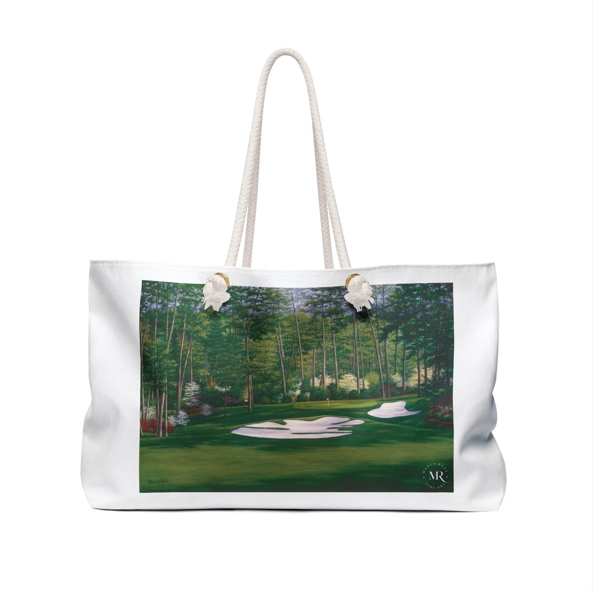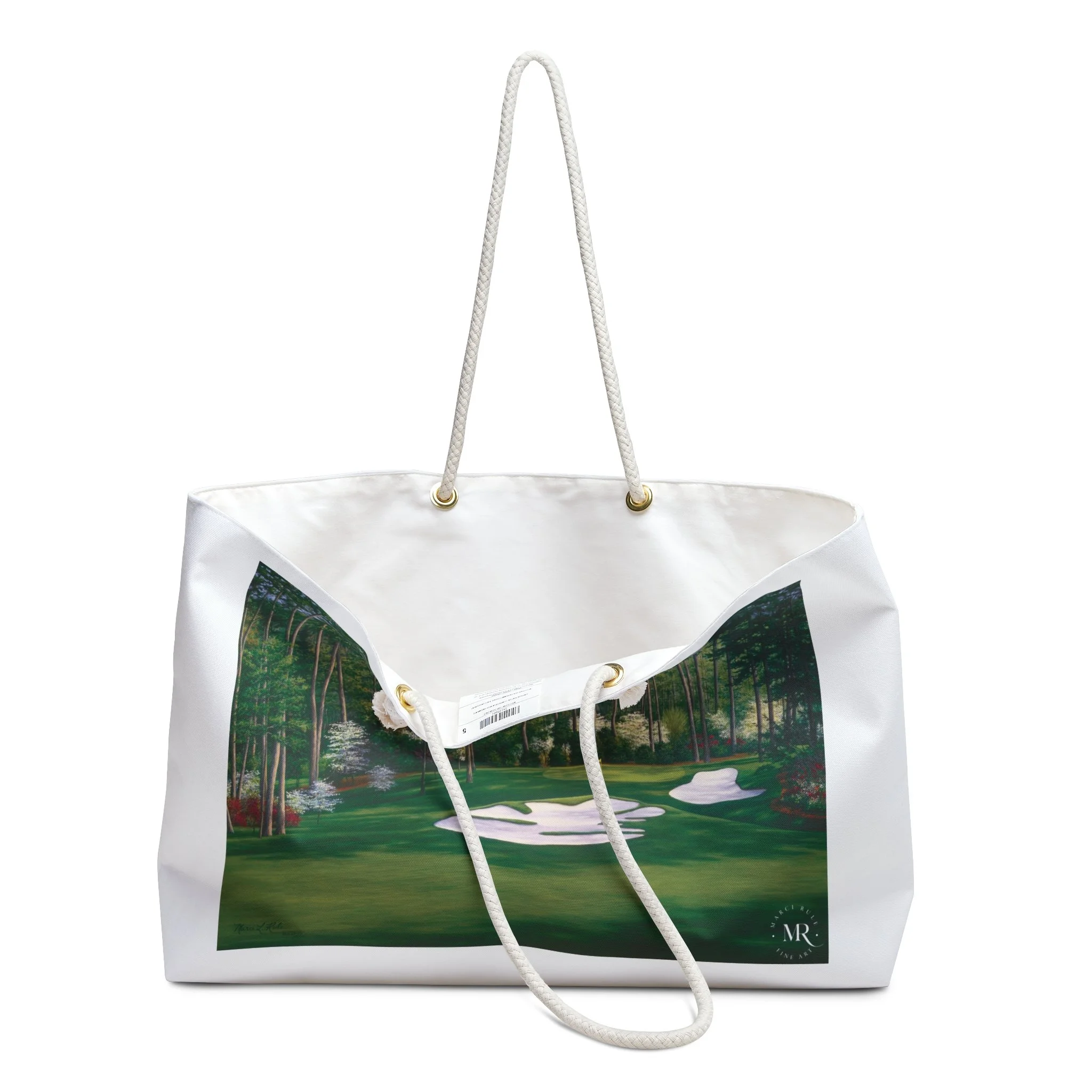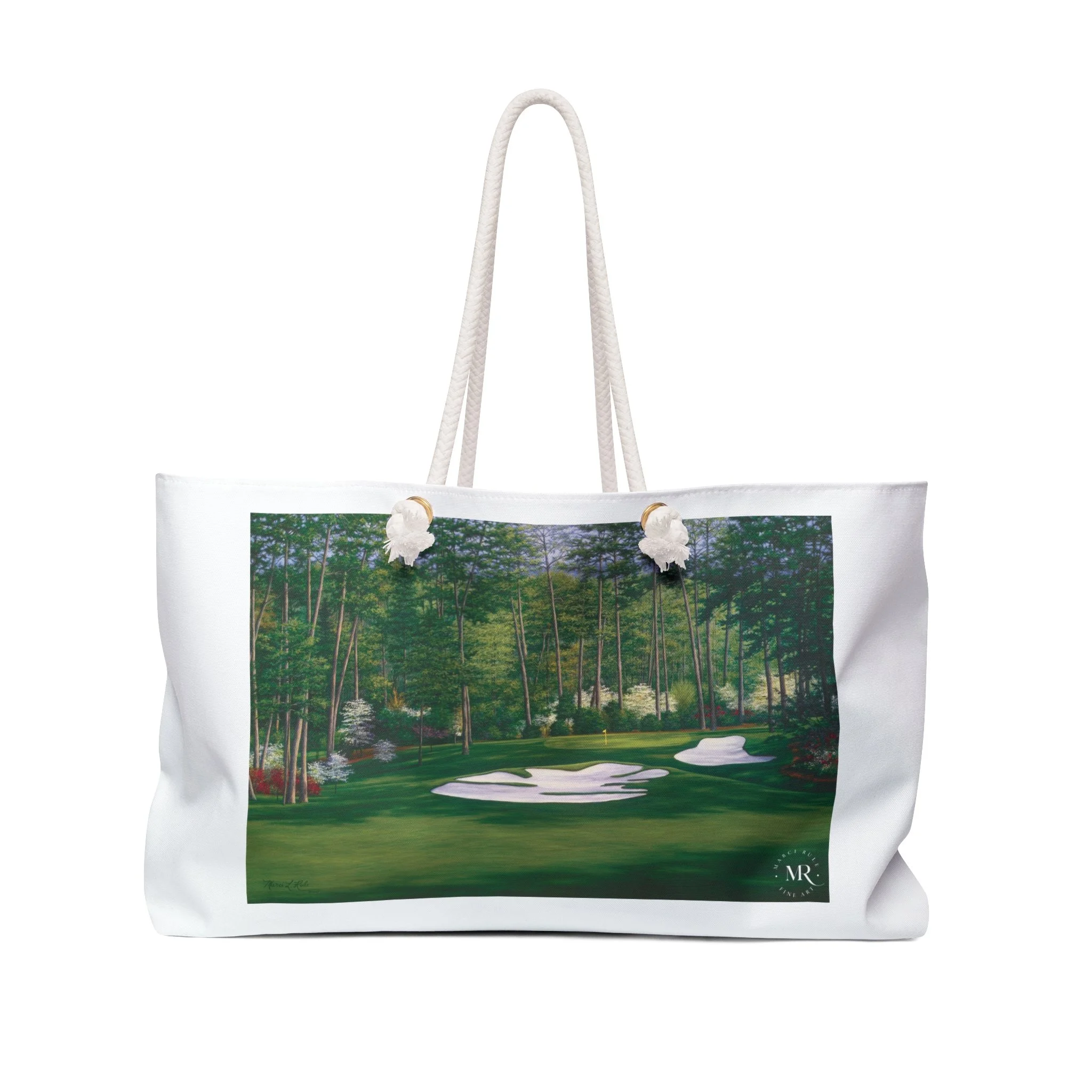 This Weekender Bag features a beautiful oil painting of Augusta #10 oil painting by Marci Rule, giving off a classy and sophisticated vibe. Perfect for weekend getaways, overnight stays, or as a carry-on duffel for travel enthusiasts. Ideal gifts for golf lovers and art enthusiasts, as well as special occasion gifts, including birthdays, Father's Day, groomsmen and best man gifts. Relevant for holidays, vacations, and weekend trips.