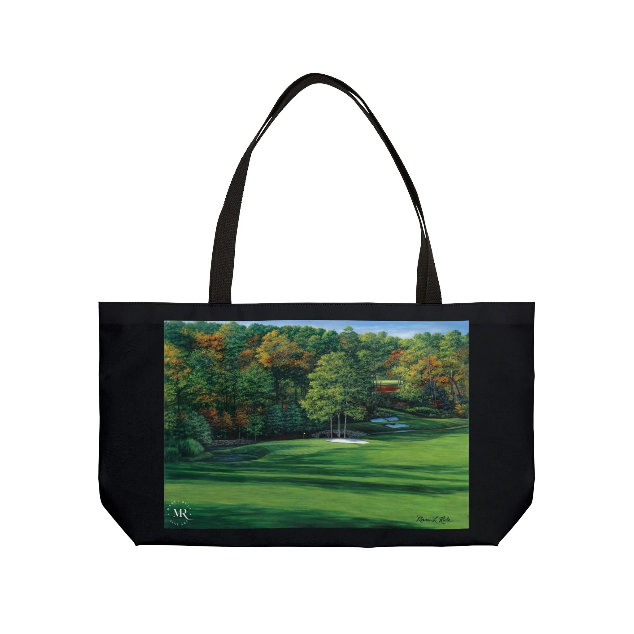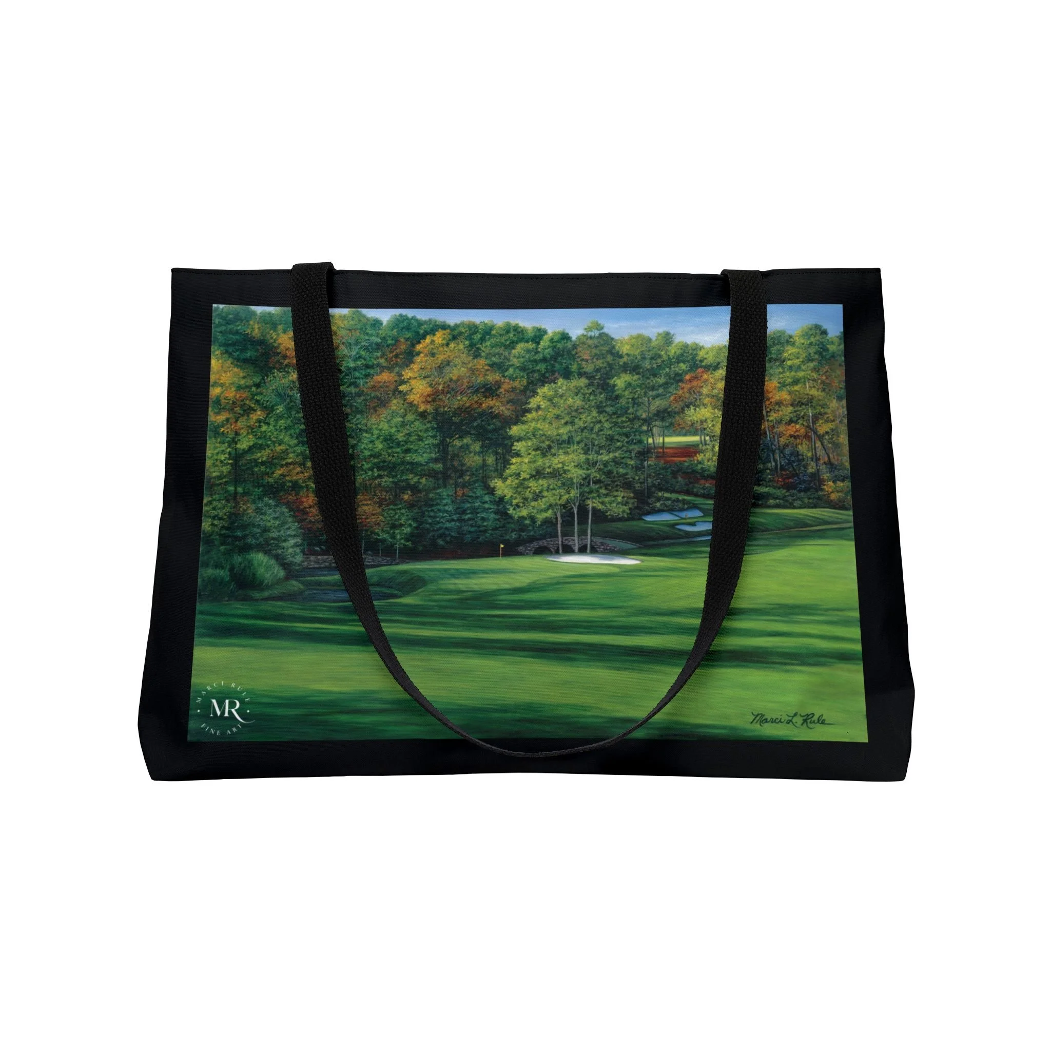 This Weekender Tote Bag features a detailed oil painting of Augusta National #11, Amen Corner, by Marci Rule. The vibrant colors and intricate design give off a sophisticated and artistic vibe, making it a perfect accessory for art lovers and golf enthusiasts. Ideal for carrying essentials for a weekend getaway or a day at the golf course. Perfect for gifting during holidays like Christmas or birthdays for those who appreciate unique and high-quality accessories.