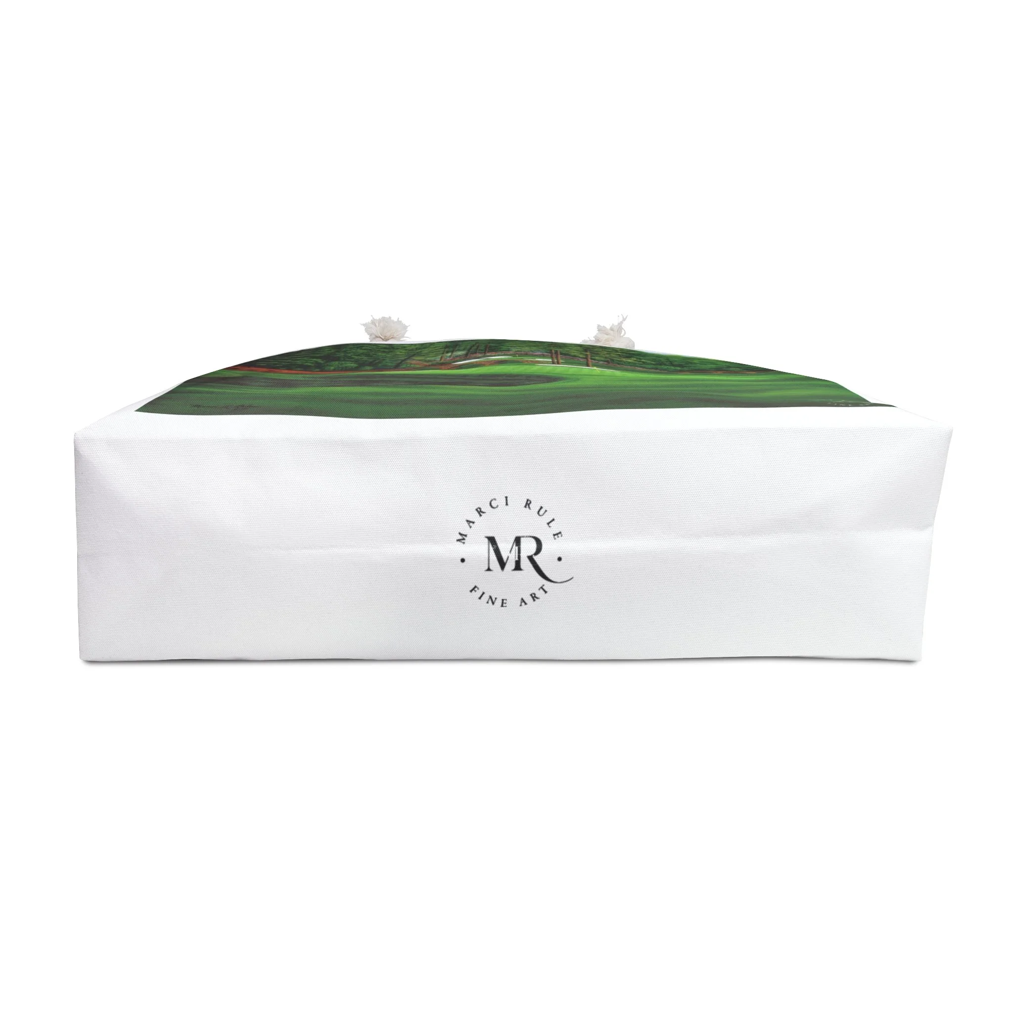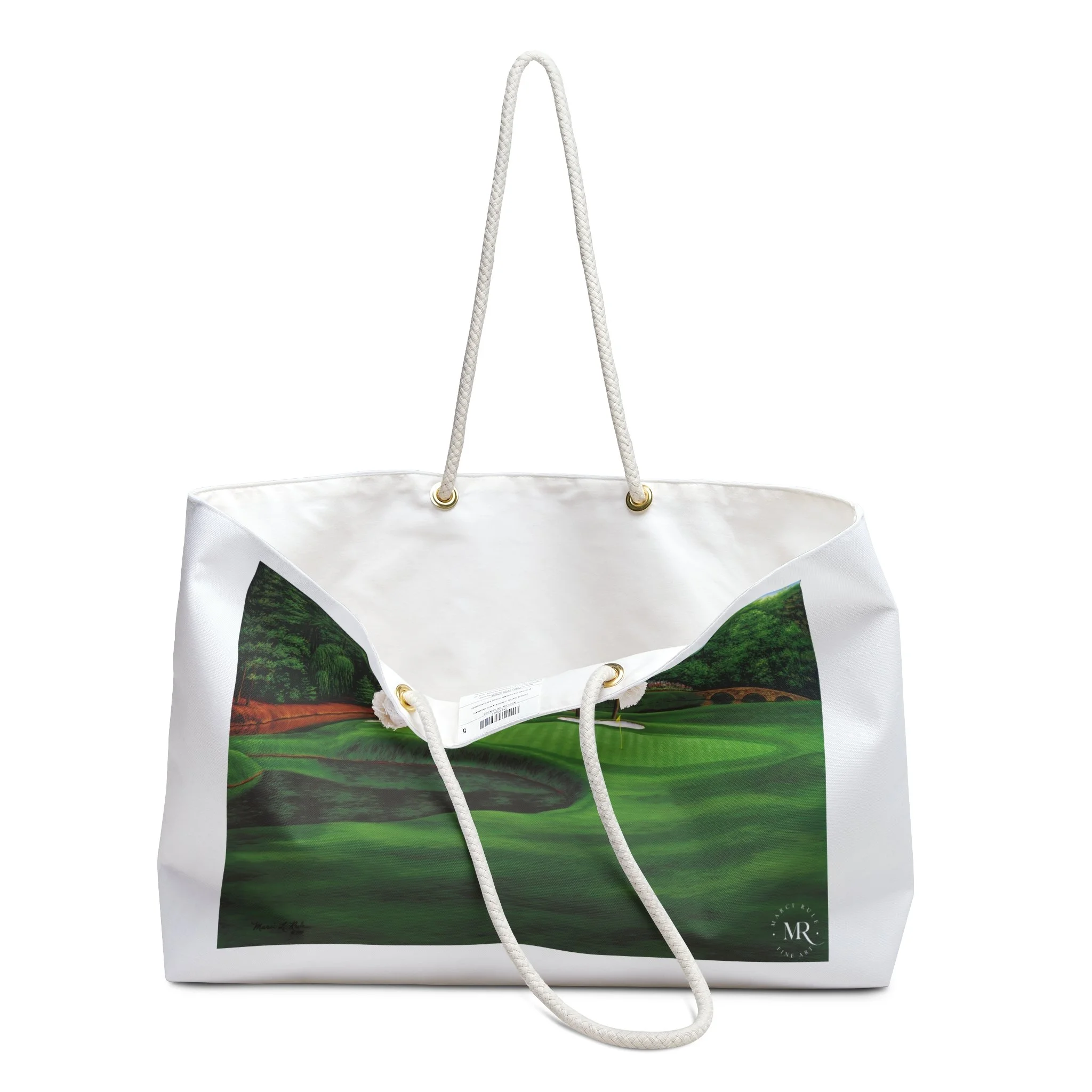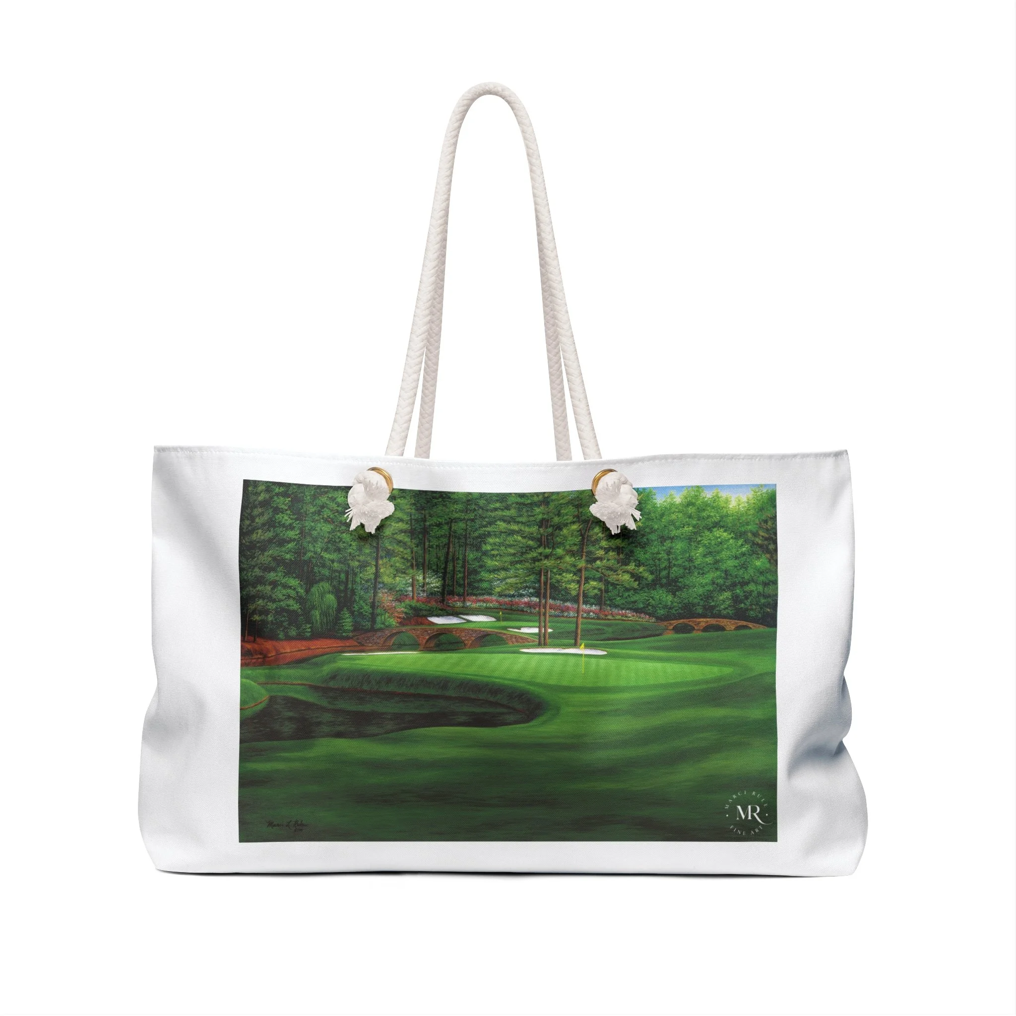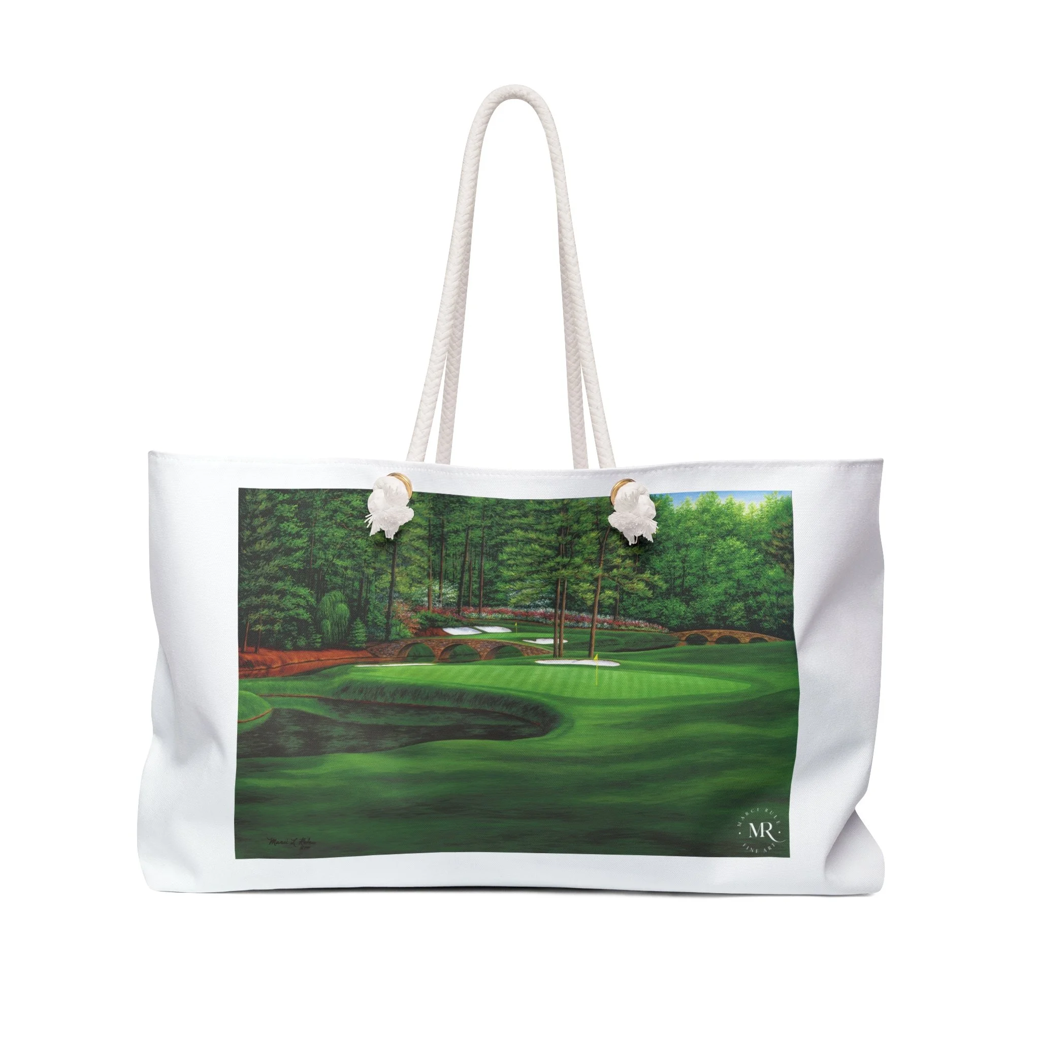 This white Weekender Bag features a beautiful oil painting of Augusta #11 by Marci Rule, giving off a classy and sophisticated vibe. Perfect for weekend getaways, overnight stays, or as a carry-on duffel for travel enthusiasts. Ideal gifts for golf lovers and art enthusiasts, as well as special occasion gifts, including birthdays, Father's Day, groomsmen and best man gifts. Relevant for holidays, vacations, and weekend trips. Product features - 100% Spun polyester exterior - Rope handles with gold color metal grommets - One size: 24" x13" - Cream sheeting interior lining (50% cotton, 50% polyester) - Assembled in the USA Care instructions - Before cleaning the bag, remove all the items from the bag. Suggested to pretreat visible stains with stain remover. Mix warm water with laundry detergent and clean the bag with terry washcloth or soft bristle brush. Let the bag air dry.