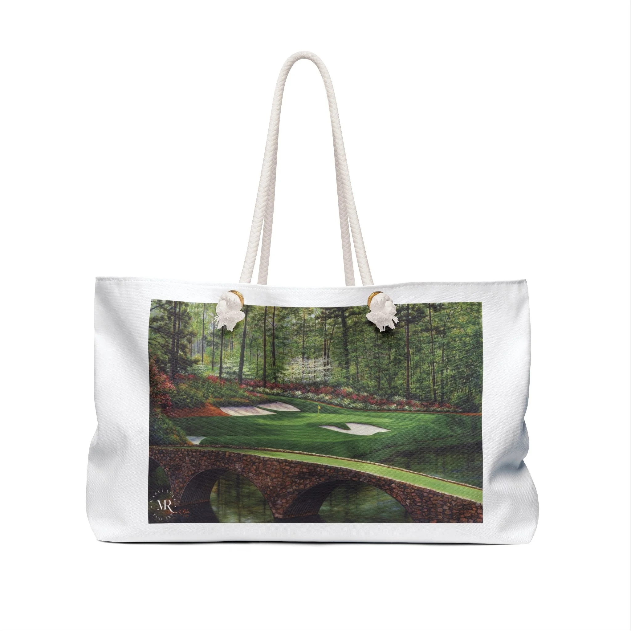 This Weekender Bag features a beautiful oil painting of Augusta #12 by Marci Rule, giving off a classy and sophisticated vibe. Perfect for weekend getaways, overnight stays, or as a carry-on duffel for travel enthusiasts. Ideal gifts for golf lovers and art enthusiasts, as well as special occasion gifts, including birthdays, Father's Day, groomsmen and best man gifts. Relevant for holidays, vacations, and weekend trips.