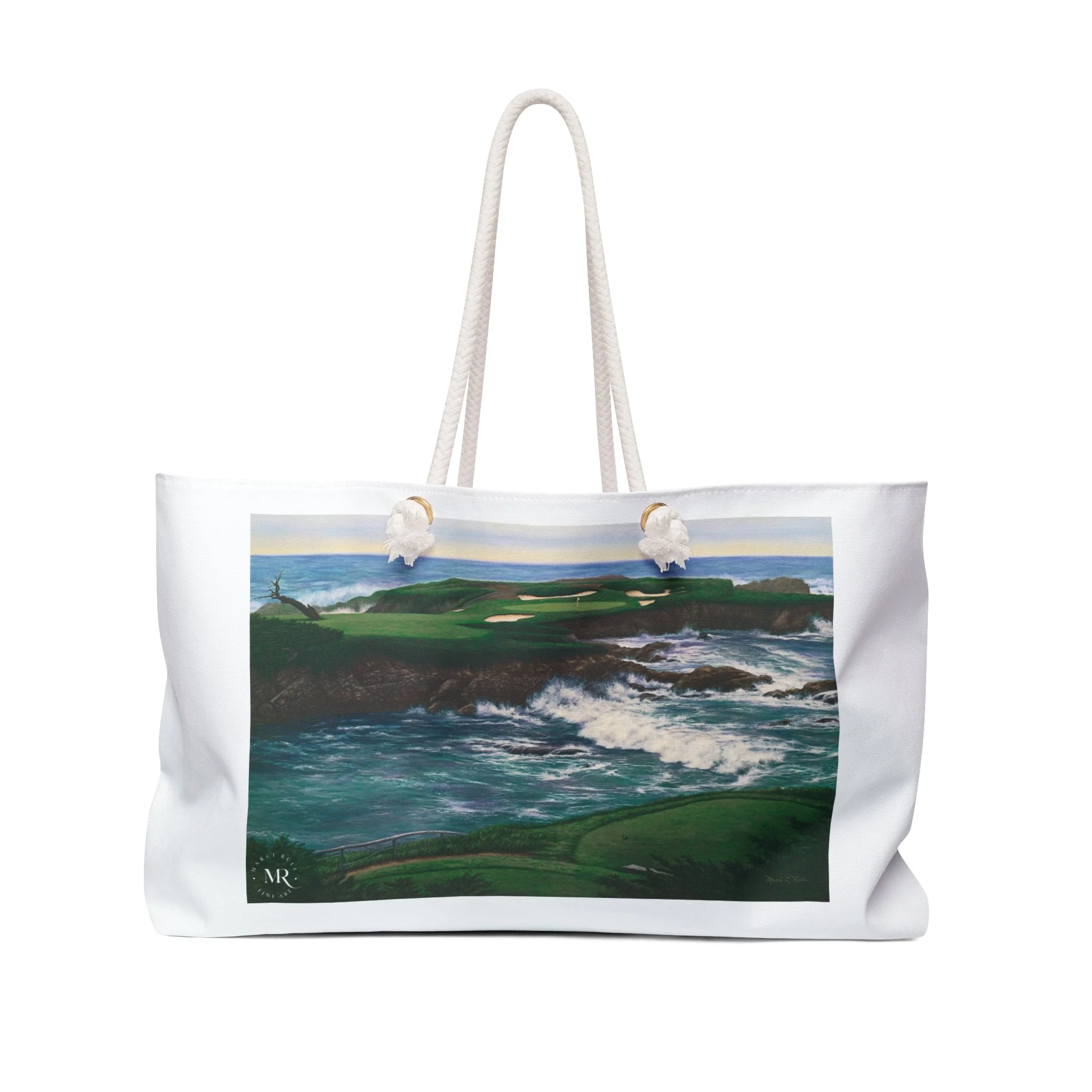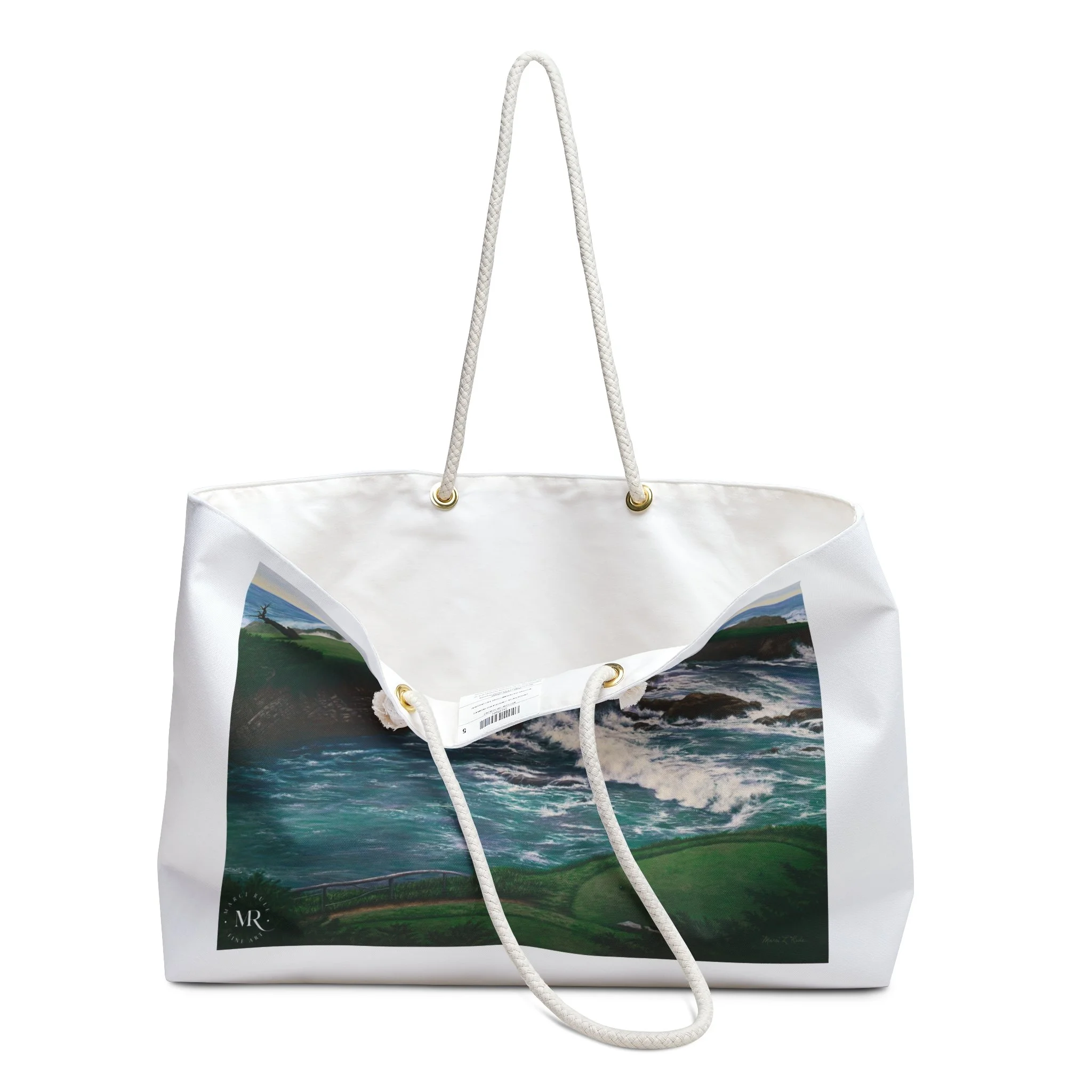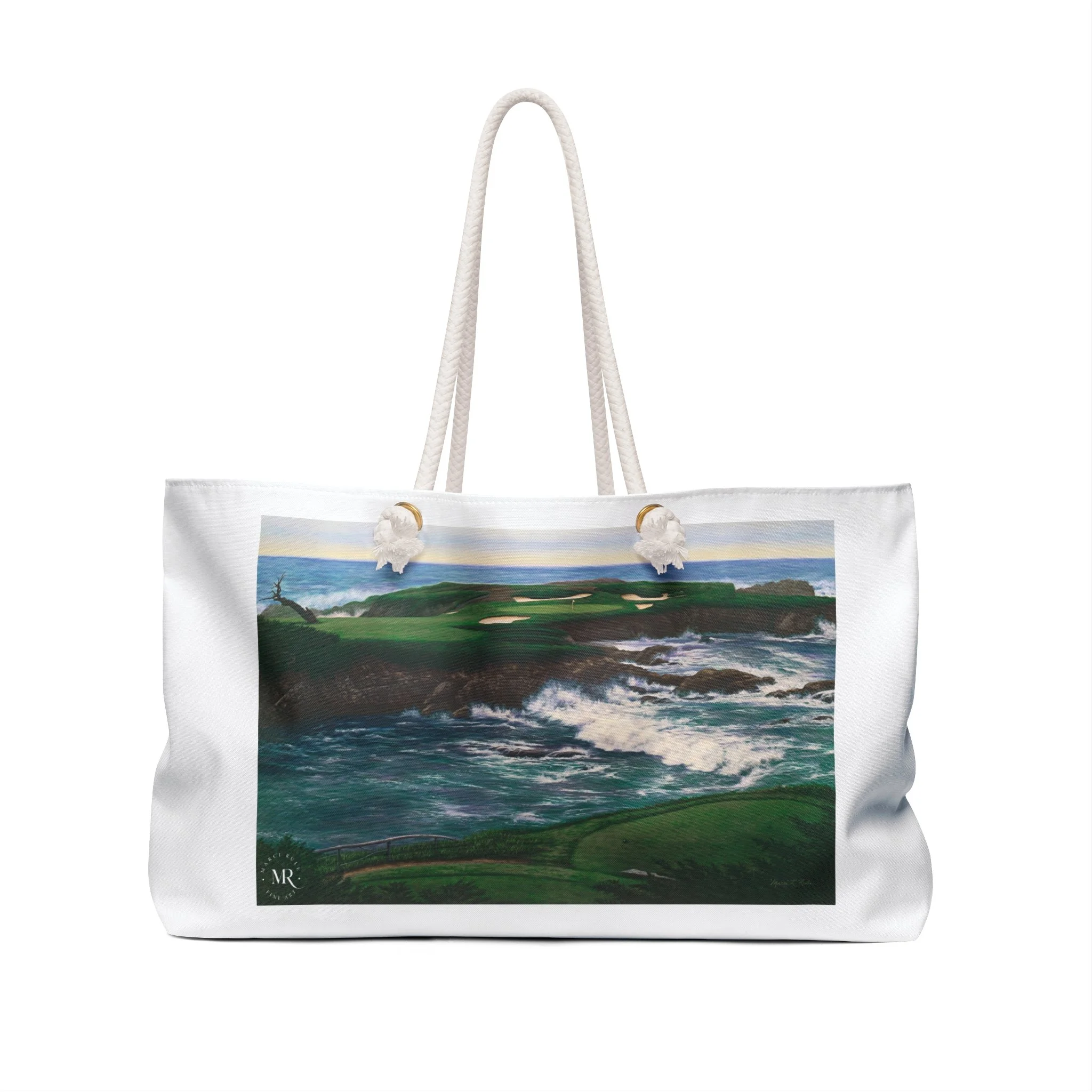This Weekender Bag features a beautiful oil painting of Cypress Point #16-Pebble Beach by Marci Rule, giving off a classy and sophisticated vibe. Perfect for weekend getaways, overnight stays, or as a carry-on duffel for travel enthusiasts. Ideal gifts for golf lovers and art enthusiasts, as well as special occasion gifts, including birthdays, Father's Day, groomsmen and best man gifts. Relevant for holidays, vacations, and weekend trips.