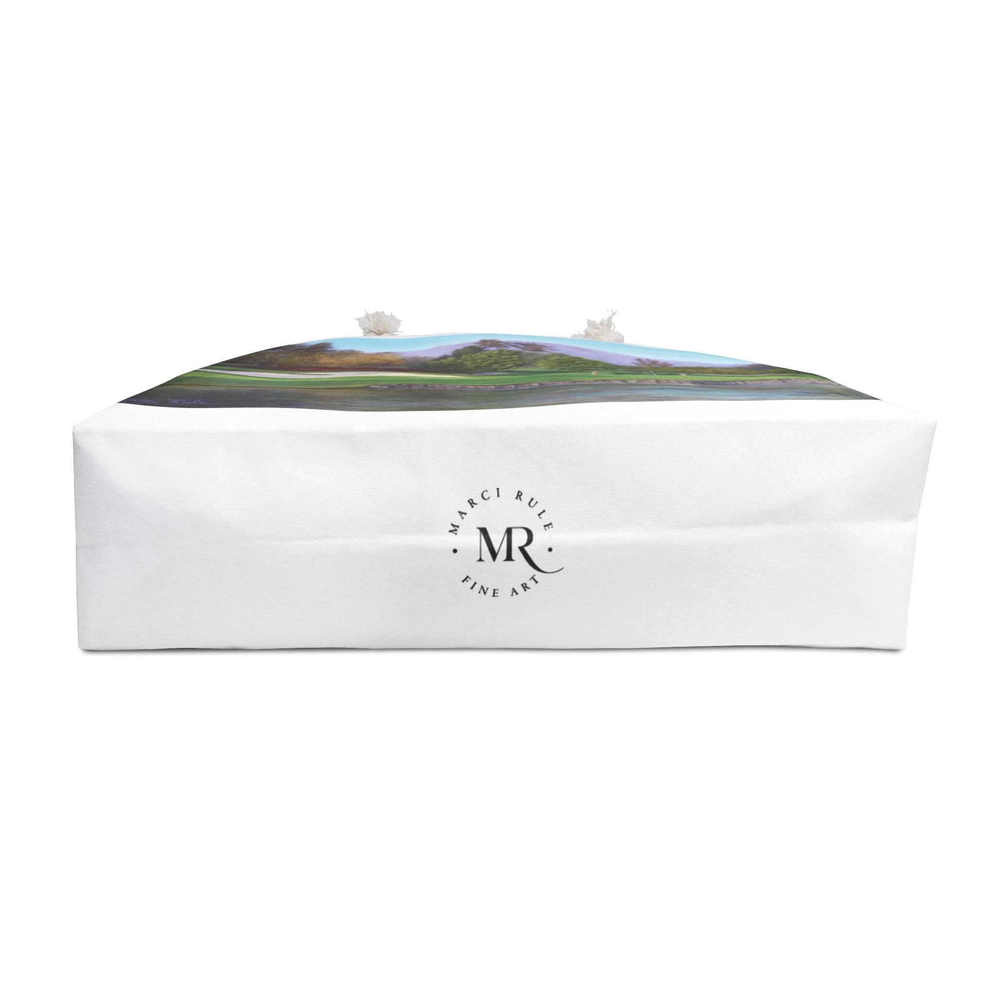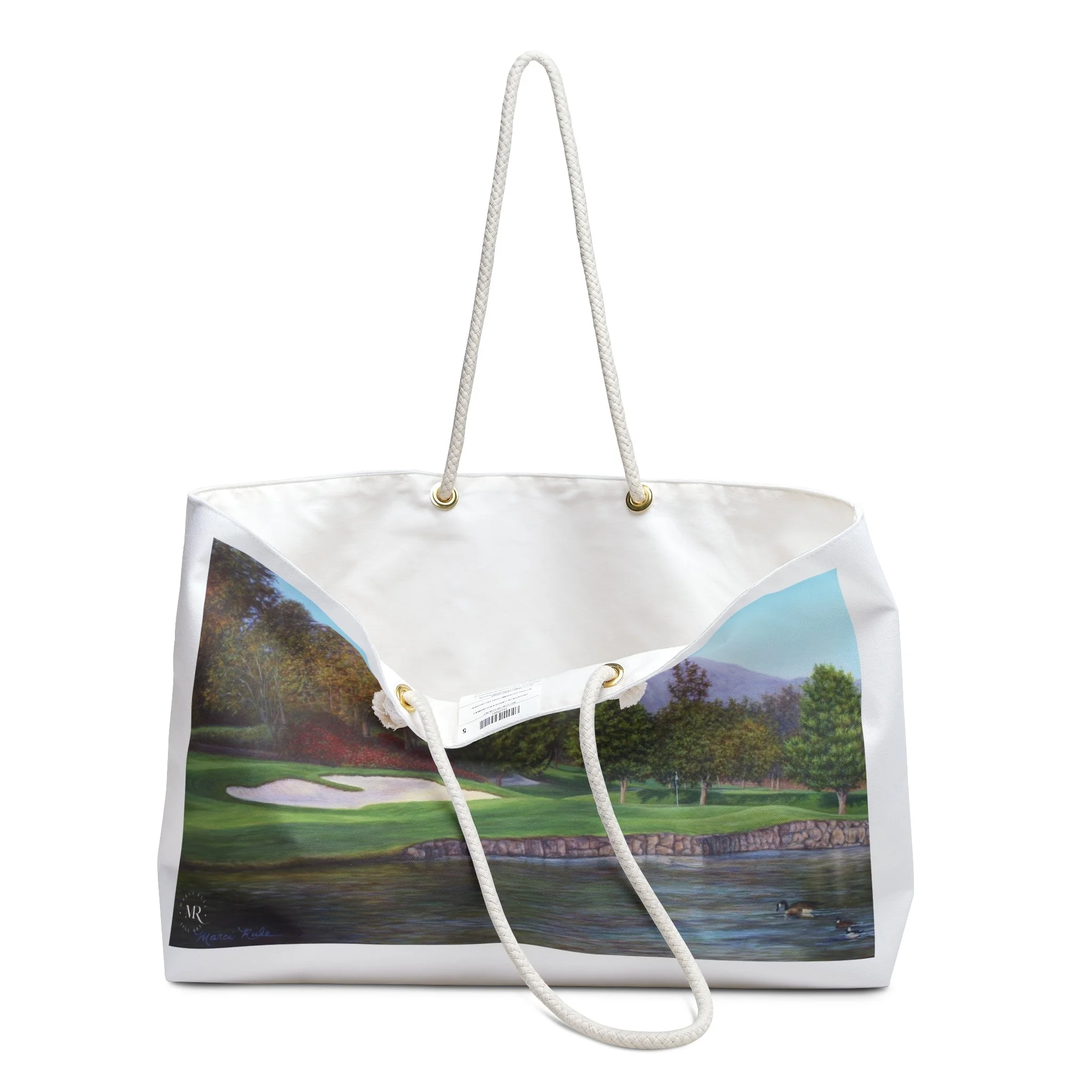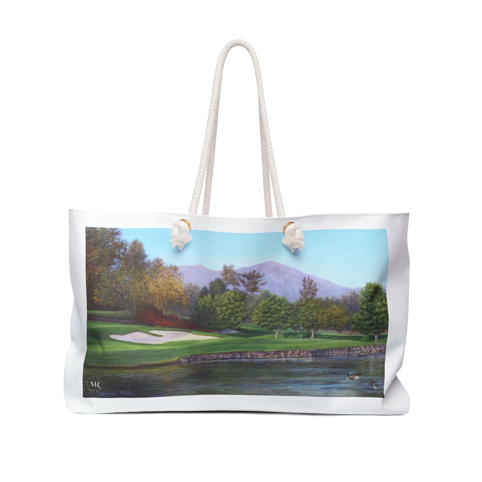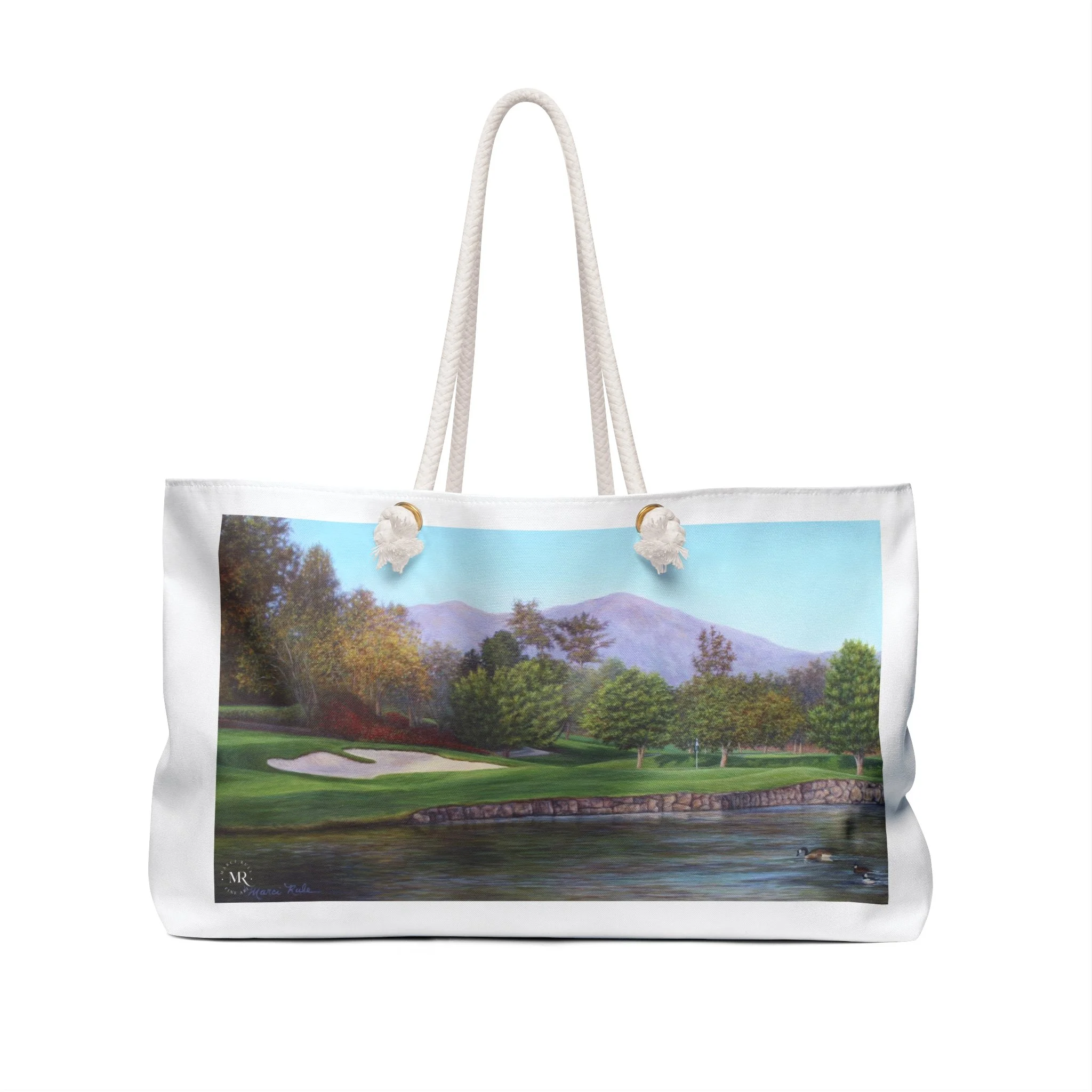 This white Weekender Bag features a beautiful oil painting of Mission Viejo Golf Course by Marci Rule, giving off a classy and sophisticated vibe. Perfect for weekend getaways, overnight stays, or as a carry-on duffel for travel enthusiasts. Ideal gifts for golf lovers and art enthusiasts, as well as special occasion gifts, including birthdays, Father's Day, groomsmen and best man gifts. Relevant for holidays, vacations, and weekend trips. Product features - 100% Spun polyester exterior - Rope handles with gold color metal grommets - One size: 24" x13" - Cream sheeting interior lining (50% cotton, 50% polyester) - Assembled in the USA Care instructions - Before cleaning the bag, remove all the items from the bag. Suggested to pretreat visible stains with stain remover. Mix warm water with laundry detergent and clean the bag with terry washcloth or soft bristle brush. Let the bag air dry.